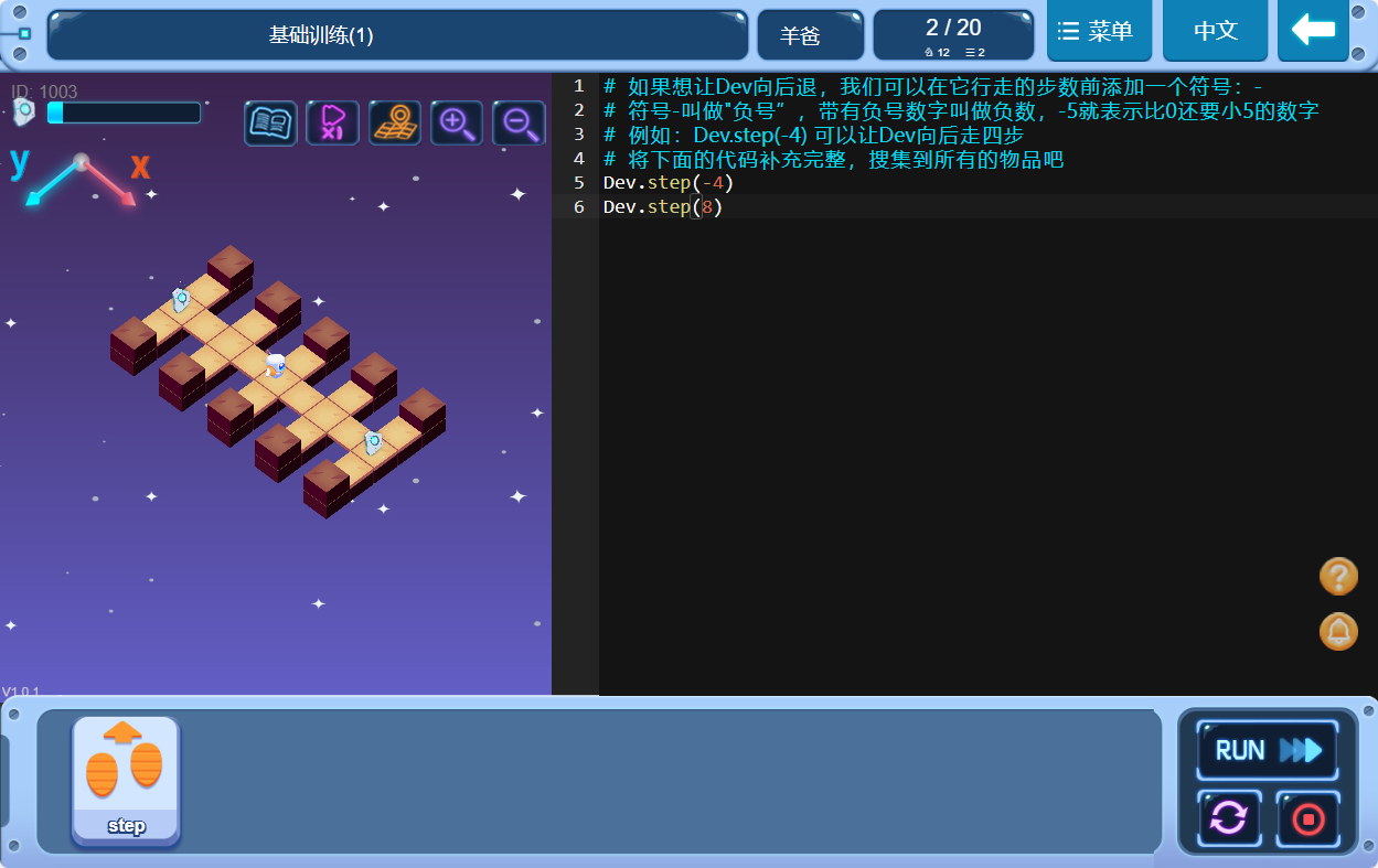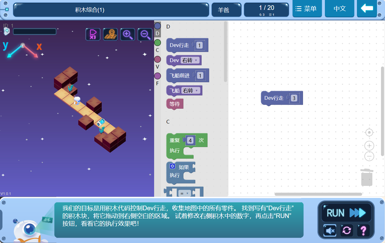 这两种模式下,选手都需要通过操控积木(图形化模式时)或编写代码(Python 模式时),让角色 “dev” 去收集界面上分布的能量体。